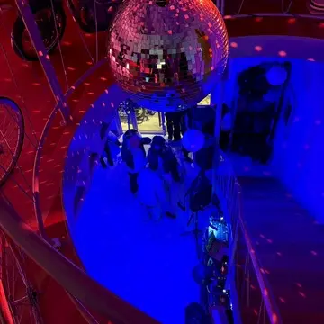 ブラックライトに照らされた空間と、天井で回るミラーボール。