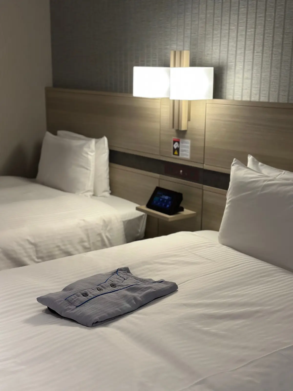 ベットはゆったり広めで、パジャマも可愛いデザインでした。