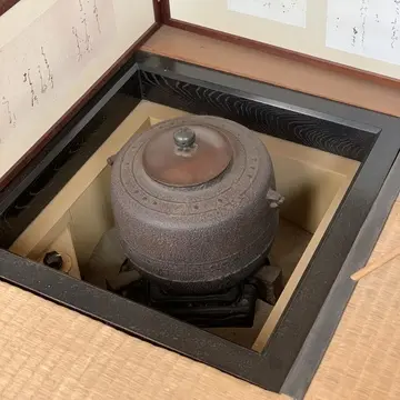 今回案内していただいた茶室には、小さな出入り口が設けられていました。入口をくぐるとお茶の道具や鎧兜が出迎えてくれます。