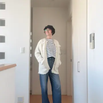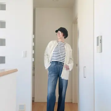キャスケット帽:STYLEDELI ツィード風ジャケット:E by eclat ボーダーTシャツ:RIVE DROITE デニムプリントパンツ:MIRAMAR ビットローファー:ArtemisByDIANA パールロングネックレス:出自不明