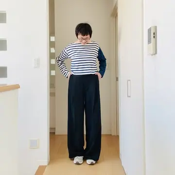 シンプルな合わせですが、パンツ丈がかなり長めなので