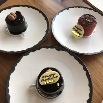 ペストリーショップで買ったケーキ、ショコラノアールとテテ。名前入りチョコプレートもつけていただき、男子二人も笑顔^^