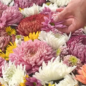 お迎え花のレッスンで使用した同じディスパッドマムも花手水のお花として浮かんでいます。