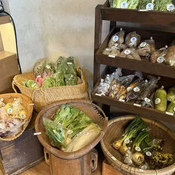 八風農園の自然な野菜やお漬物などの新上木食堂のオリジナル商品や地元を中心としたセレクト品が並んでいて、待ち時間も楽しく過ごせる工夫がされています。