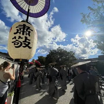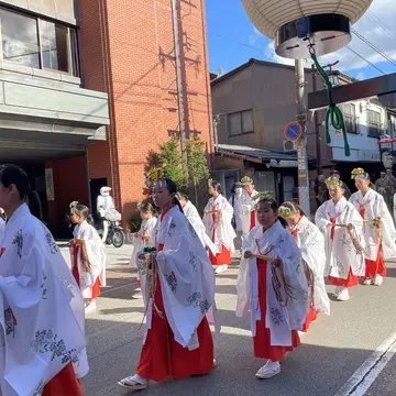 お囃子や雅楽を奏でながら、神様を神輿に乗せて町内を巡ります。