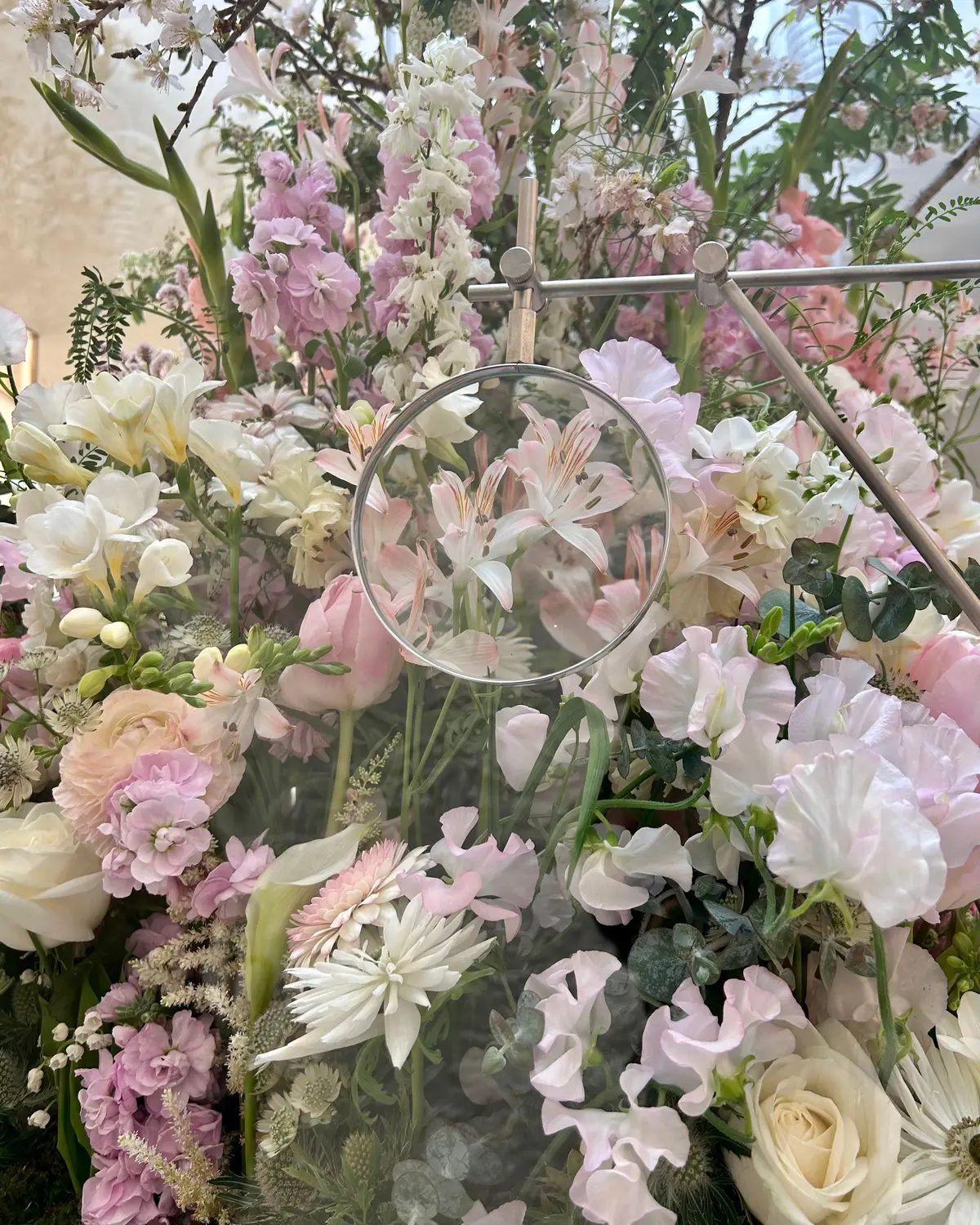 フラワーアーティスト東信氏によるアート作品は、ディオールの実際のバッグの中に生花を封じ込めた圧倒的な存在感。