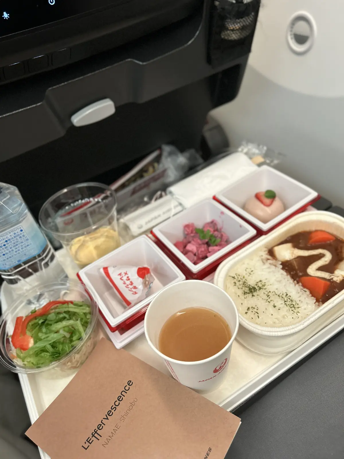 でも、飛行機内で食べて飲まなきゃ寝られない。