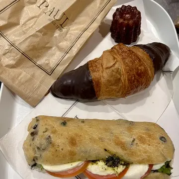 クロワッサンが特に美味しかったのでチョコクロワッサンと、生地にオリーブが入ってモッツアレラチーズとトマトのカプレーゼのようなサンドイッチ、カヌレを食べていないことに気づきカヌレも購入。