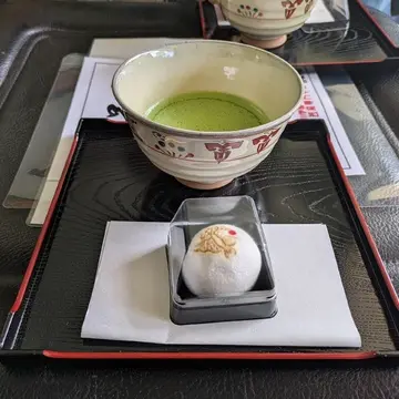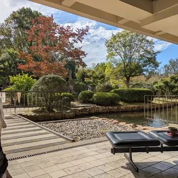 沢山の宝物を見終わった後は、お茶席で庭園を眺めながら、お茶を一服♪幸せなひととき…。