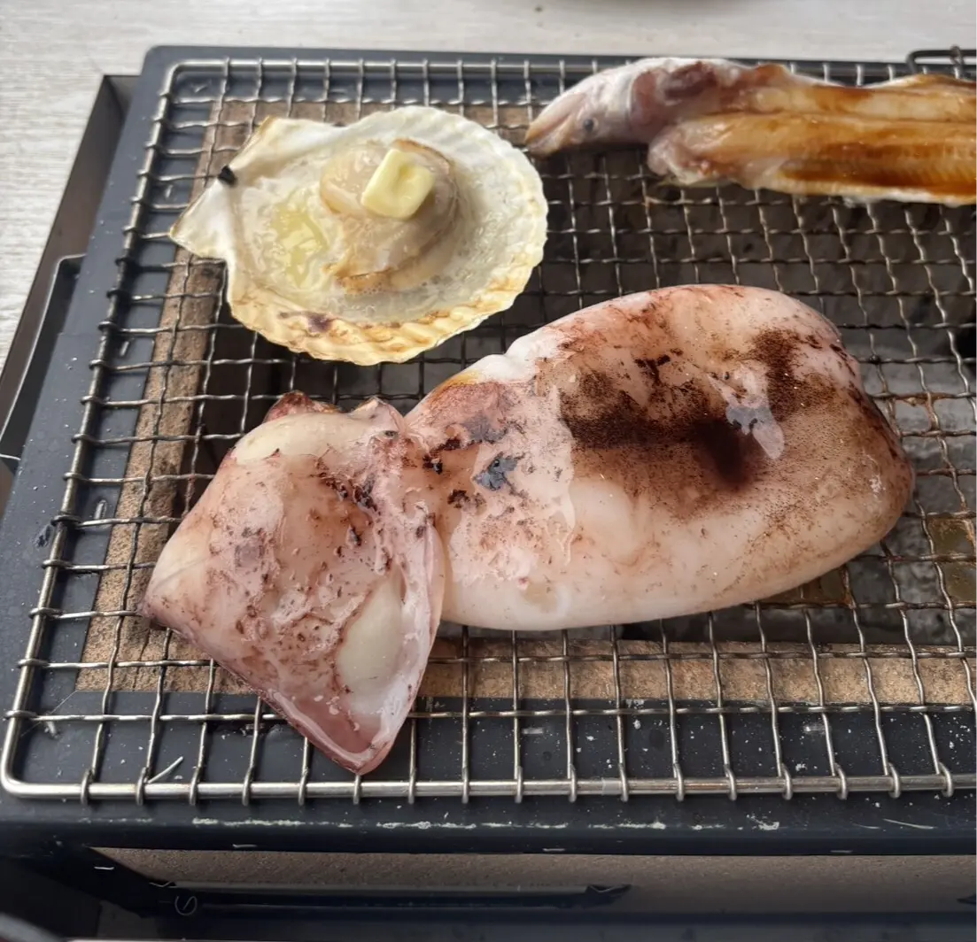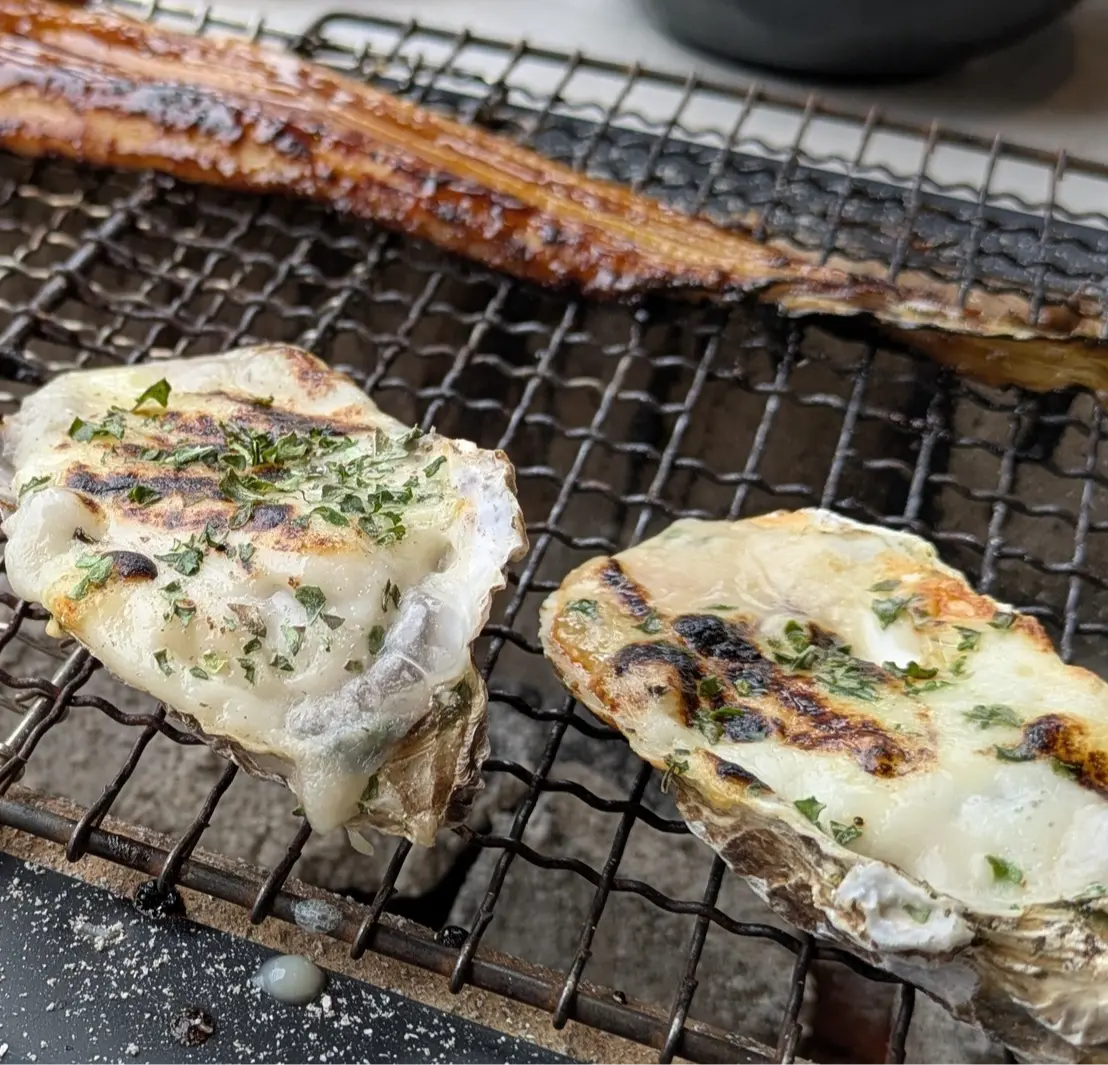 炭の灰が降り、牡蠣がパチパチ爆ぜる中、ひたすら食べ続けて(笑)