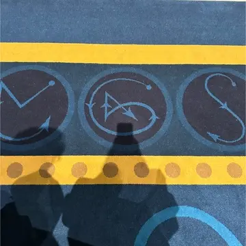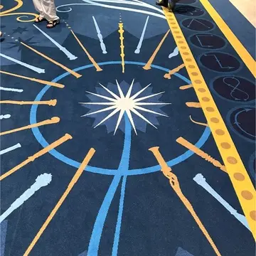 ロビーではカーペットをよく見ると、杖と(左)と呪文の時の杖の動かし方(右)の絵が。