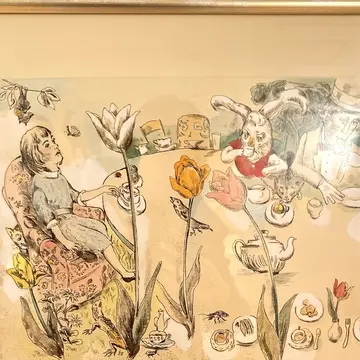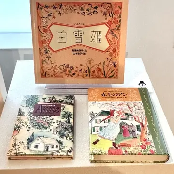 Ⅱ期(3/3〜5/27)では特に「グリム童話」の白雪姫、「赤毛のアン」、「不思議の国のアリス」や「鏡の国のアリス」など、世界文学や絵本の挿絵作品が150点ほど所狭しと飾られ、作品はどれもカラフルな色使いで、絵本や文庫本も置かれていました。