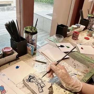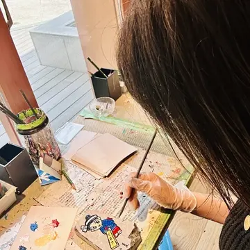 石灰石にペンキで絵を描き、温泉につけると石は溶けてペンキで塗った部分が浮かび上がる「百年石製作」にチャレンジ。