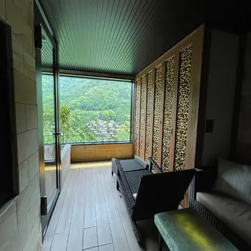 部屋のその先は、ゆったりとしたテラスが設けられていて露天風呂から出た後、ソファーに座ると山からおりてくる風が身体を癒してくれます♪