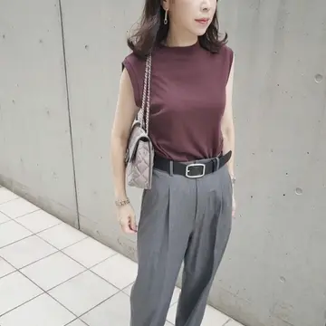 ボルドー×グレーの色合わせならノースリーブでも秋らしさを演出できるように思います😊。