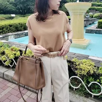 エクリュカラーのパンツに合わせ、ベージュのニットで同系色のコーディネートにしました。