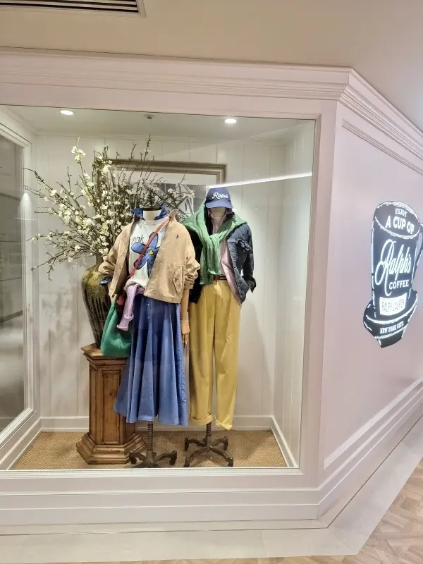 ニューヨークに本社を置くラルフローレンらしいトラッドなファッションのディスプレイが目を惹きます。