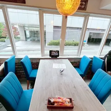こちらの窓際のブルーの席に通して頂きました。