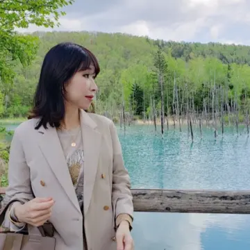 青く澄んだ池の青と立ち枯れた木とのコントラスト、神秘的なこの景色を実際に見ることができ、本当に感動でした!