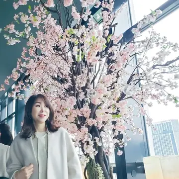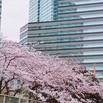 汐留のエリア、桜がとても綺麗に咲いていたので記念に何枚か撮ってもらいました。