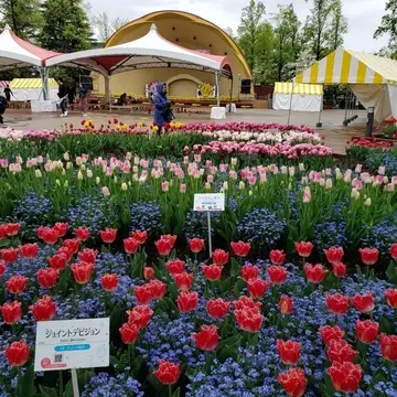 大花壇では、17種類21万本ものチューリップが地上絵を描いています。