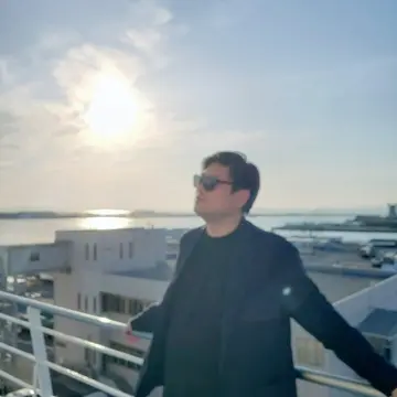 夕暮れのクルーズを堪能する夫