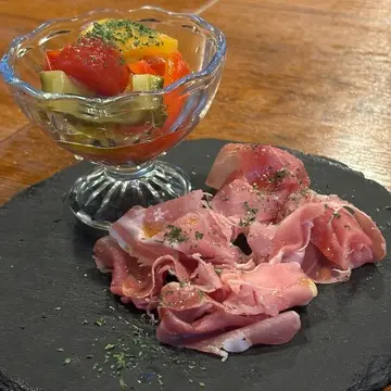 前菜は生ハムとピクルス。