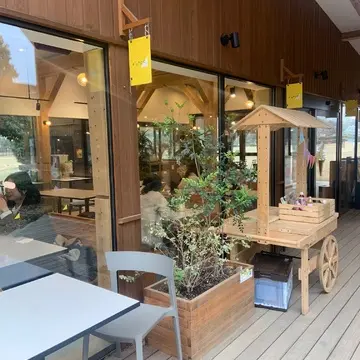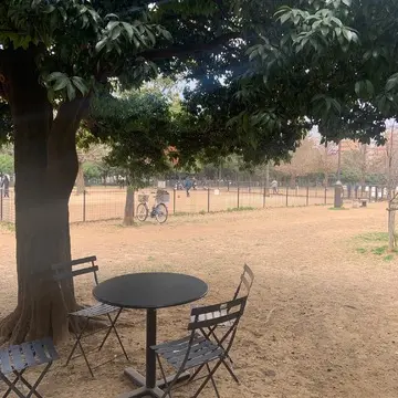 このカフェはそのすぐ横にあるのでお店の周りにはワンちゃんと楽しめる様に丸テーブルがいっぱい並べてあります!