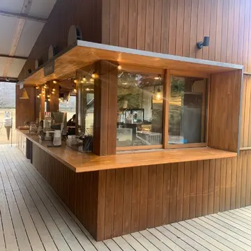 木々の中に浮かび上がるカフェって感じ。