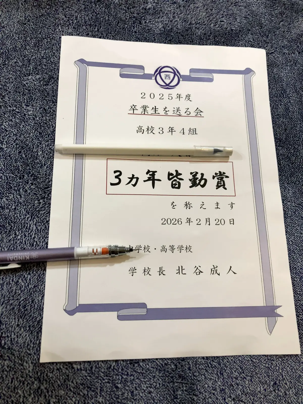 三年間無遅刻無欠席、皆勤賞いただきました。