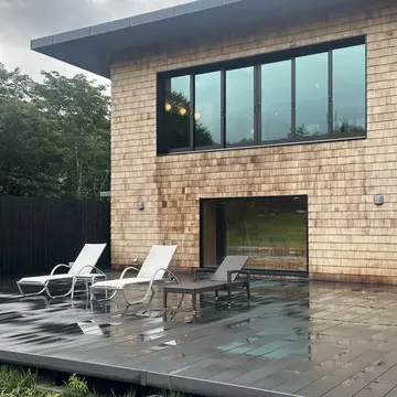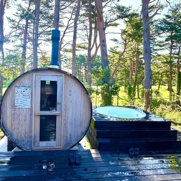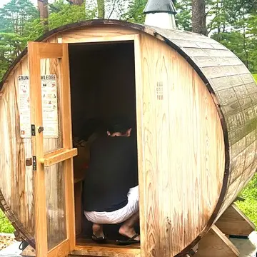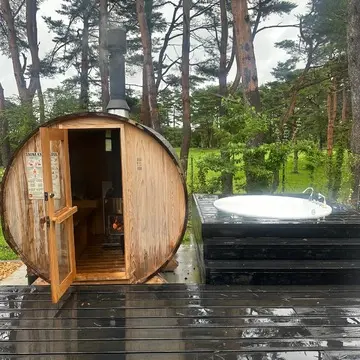 広いテラスにバレルサウナとアウトドアバスが付いたお部屋で、テラスは隣のゴルフ場の13番ホールのすぐ隣なので、サウナとバスを使う場合は水着着用です。