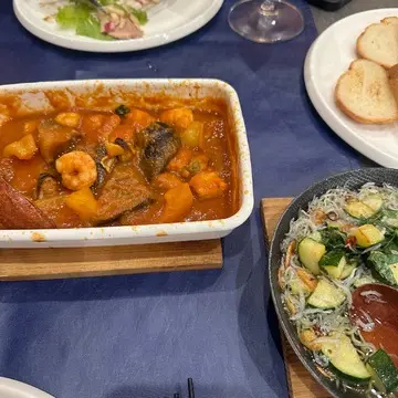 鴨肉の和風マリネ、サラダ仕立てしらすとズッキーニ、大葉のオイル煮、ガーリックトースト添え