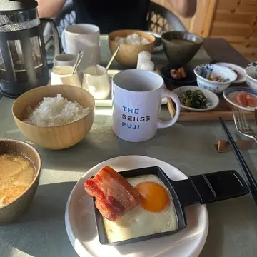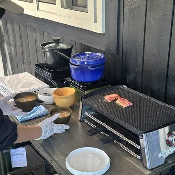 ベーコンと目玉焼きをテラスで作ってもらいました! ご飯も炊いているところ