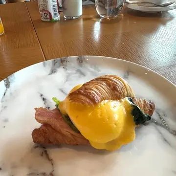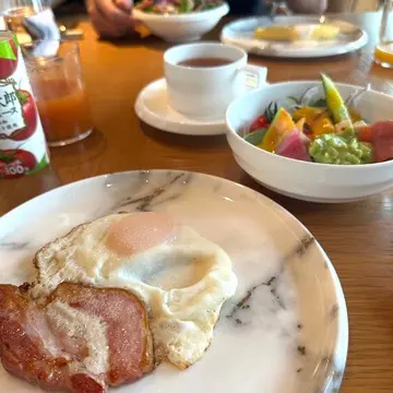 私は定番の目玉焼きとベーコンを、娘はクロワッサンエッグベネディクトをチョイス。