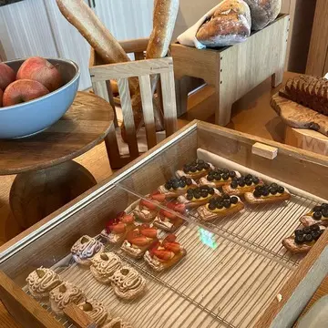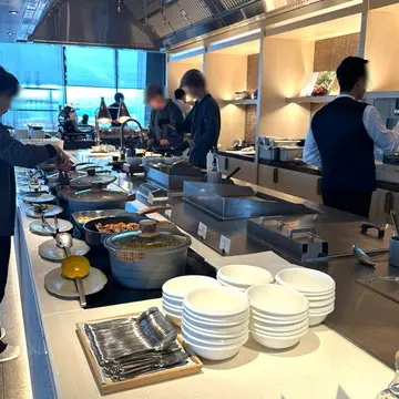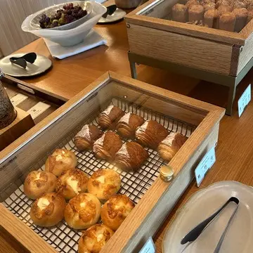朝食は和洋のビュッフェスタイルで、サラダやハム、和惣菜の小鉢、ペストリーにヨーグルト、フルーツなど豊富なラインナップ。