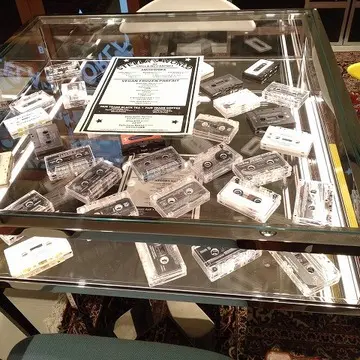ガラス張りテーブルには懐かしいカセットテープでディスプレイ