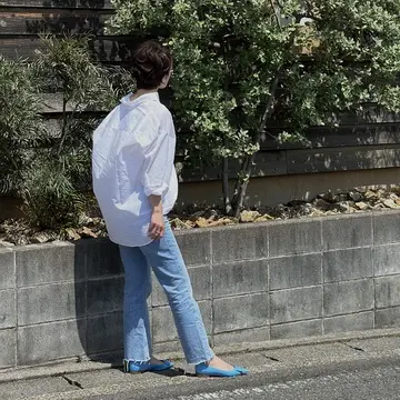 薄いブルーカラーはゆったりな白シャツと合わせて、カジュアルに。