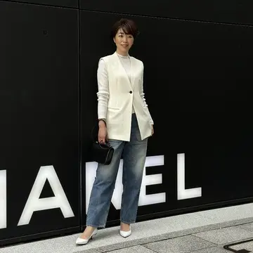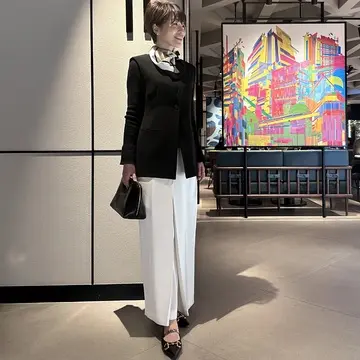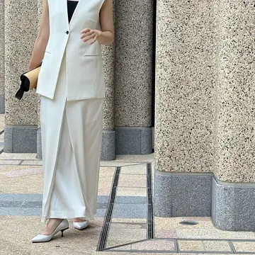 ジレとスカートはセットアップの様に見えますが、実はブランドも素材も異なるもの。白のトーンのみを合わせ、セットアップのように繋げました。