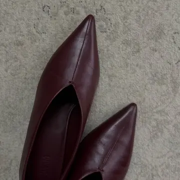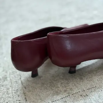シックなボルドーの甲高のパンプスはブーティの様で、ラップパンツから覗く姿は全体のスタイルを纏めてくれる存在。