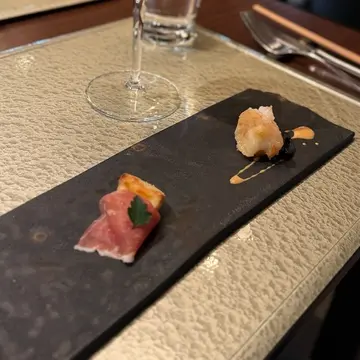アミューズの盛り合わせからスタートし、季節のお野菜の前菜。お野菜の脇には帆立、バルサミコソースと一緒に頂きました。