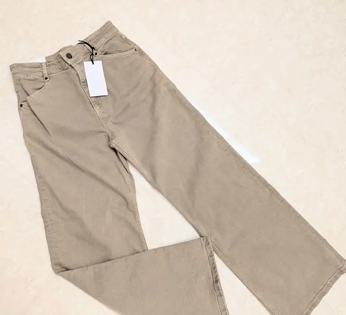 ベージュのデニムとオフホワイトのブラウスで優しげな印象に。