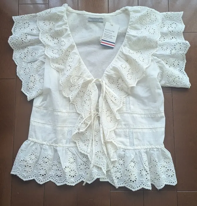 こちらは今季購入した、ZARAのハイウエストデニムとBAYFLOWのスカラップレースフリルブラウスを着用しています。