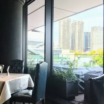 水辺と浜離宮の緑を臨むように、大きく窓が取られている開放的な店内。色味を抑えた家具も落ちついた印象で素敵です。
