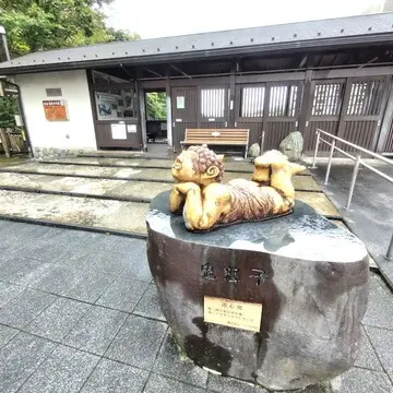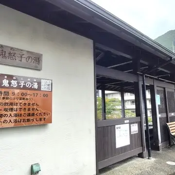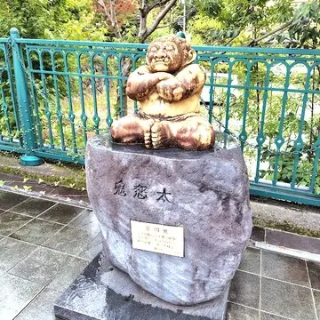 鬼怒川の絶景を眺めながら暖まれる公営の足湯には、"鬼怒子”(笑)。寝そべっている女の子の鬼ちゃんがいました。