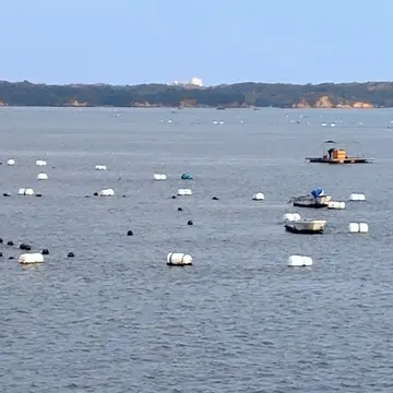 海には、たくさんのブイが浮かび、その下数メートには、養殖用の貝があるそうです。