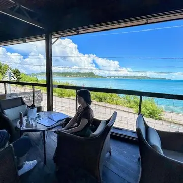真っ直ぐに伸びる海に囲まれた橋を渡り、離島のオープンカフェでランチ💗