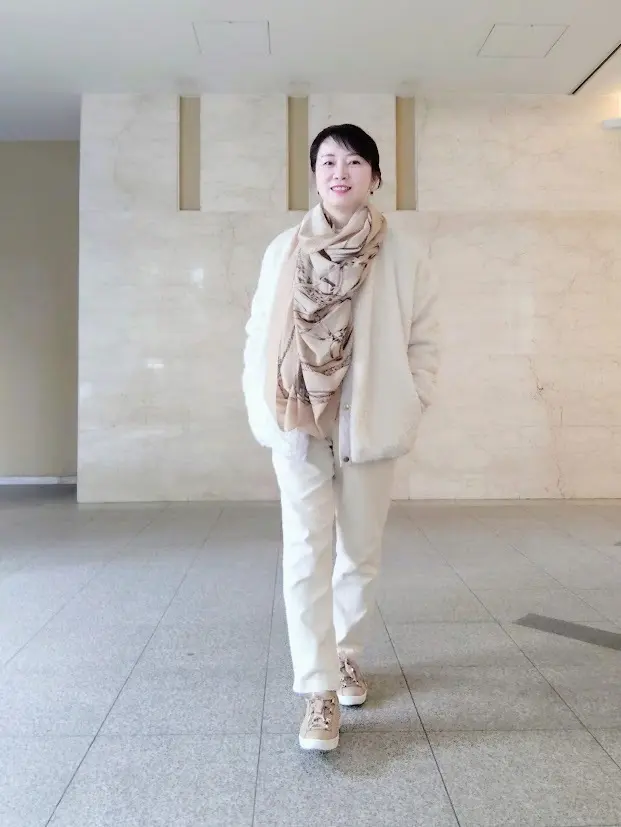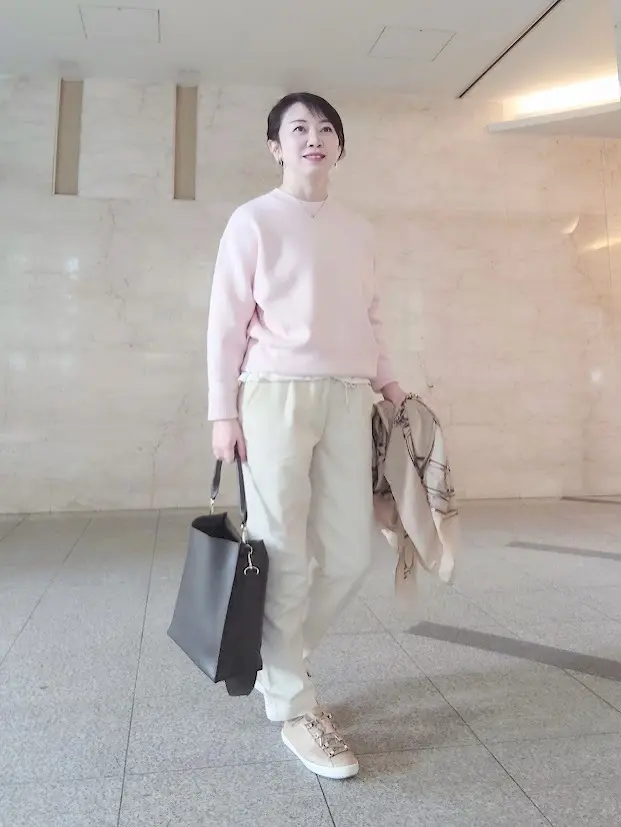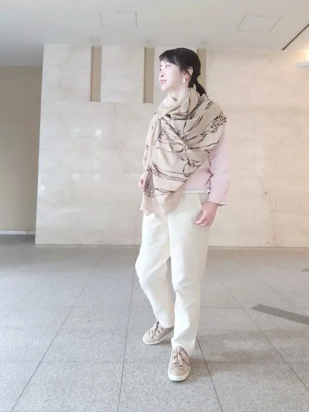 スニーカーで軽やかな雰囲気に、ホワイトを基調に春先取り旅を楽しむコーデです。