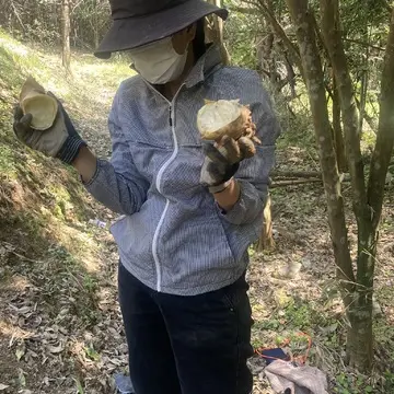 山には鳥のさえずりが聞こえ木の枝からは新芽が出ており春を肌で感じます。筍を見つけるには土が少し盛り上がっている所を探すのがコツ。後は筍を傷つけずただひたすら土を掘り続けます。