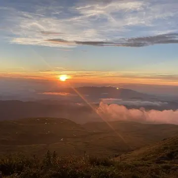 月山の頂上で見たご来光は今まで見たことがない神々しい素晴らしいものでした。夜中真っ暗な所から頭にLEDライトを付け自分の足元しか見れなく、それでも必死に登っていきました。