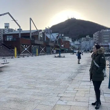 ウォーターフロントから函館山が見えます。ちょうど夕日が沈んで綺麗な輪っかが山にかかりました。